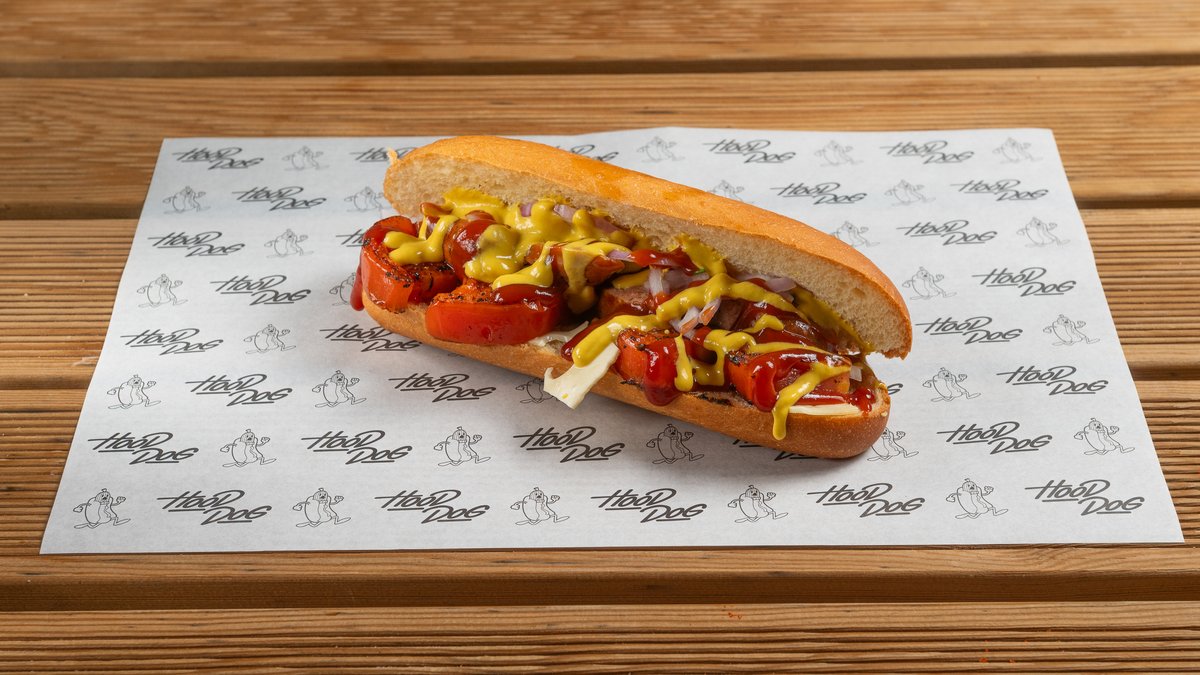 Λουκάνικο Φρανκφούρτης, bacon, ντομάτα, καραμελωμένο κρεμμύδι και bbq σως
