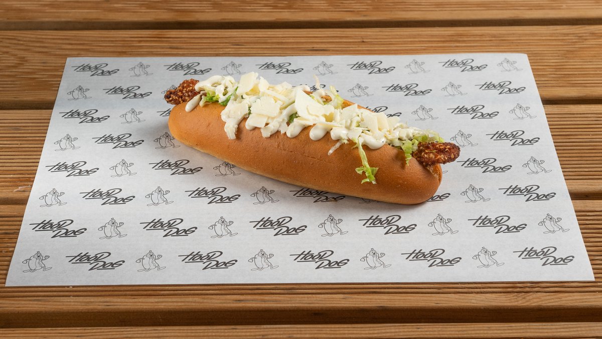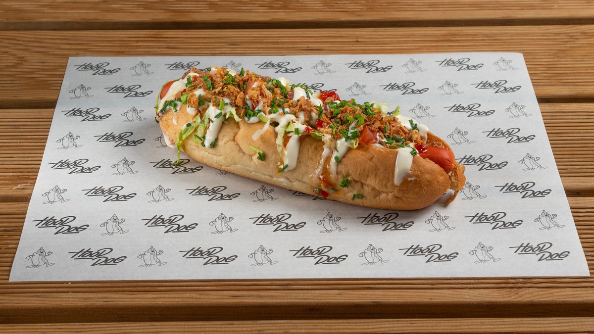 Λουκάνικο Φρανκφούρτης, ντομάτα, iceberg, crispy onion, chives και μαγιονέζα