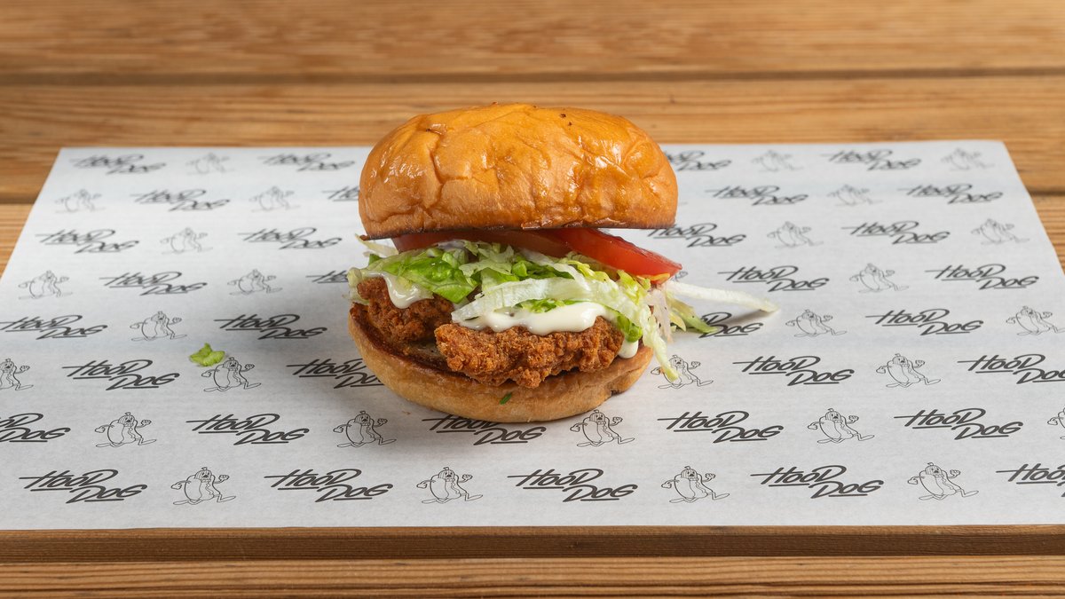 Φιλετάκια παναρισμενο κοτόπουλο σε Potato bun , cheddar,iceberg,tomato,sweet chilly sauce και μαγιονέζα