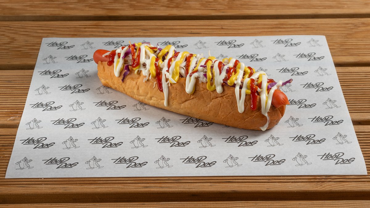 Λουκάνικο Φρανκφούρτης, κέτσαπ, μουστάρδα, μαγιονέζα και λάχανο - καρότο