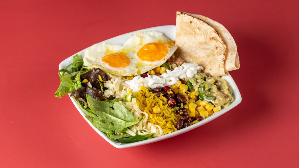 Με ρύζι, γουακαμόλε, μαύρα φασόλια, καλαμπόκι, sour cream, τυρί, πιπεριές, 2 τηγανητά ή ποσέ αυγά και τορτίγια