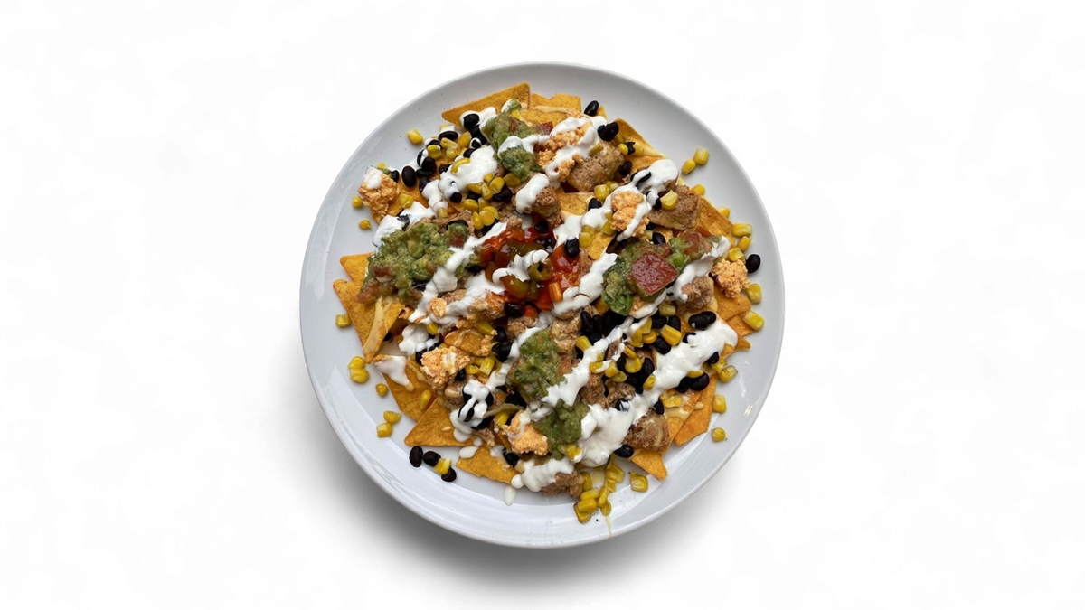 Mε κοτόπουλο, cheddar sauce, πικάντικη κρέμα τυριού, sriracha aioli, pico de gallo, καλαμπόκι, μαύρα φασόλια pinto και guacamole
