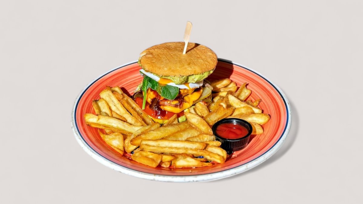 Arepa, χειροποίητη πίτα καλαμποκιού από την Βενεζουέλα με μοσχαρίσιο μπιφτέκι smashed, αυγό τηγανητό, πίκλες, ντομάτα, καραμελωμένα κρεμμύδια, μαρούλι και Hopper`s sauce. Συνοδεύεται από chips