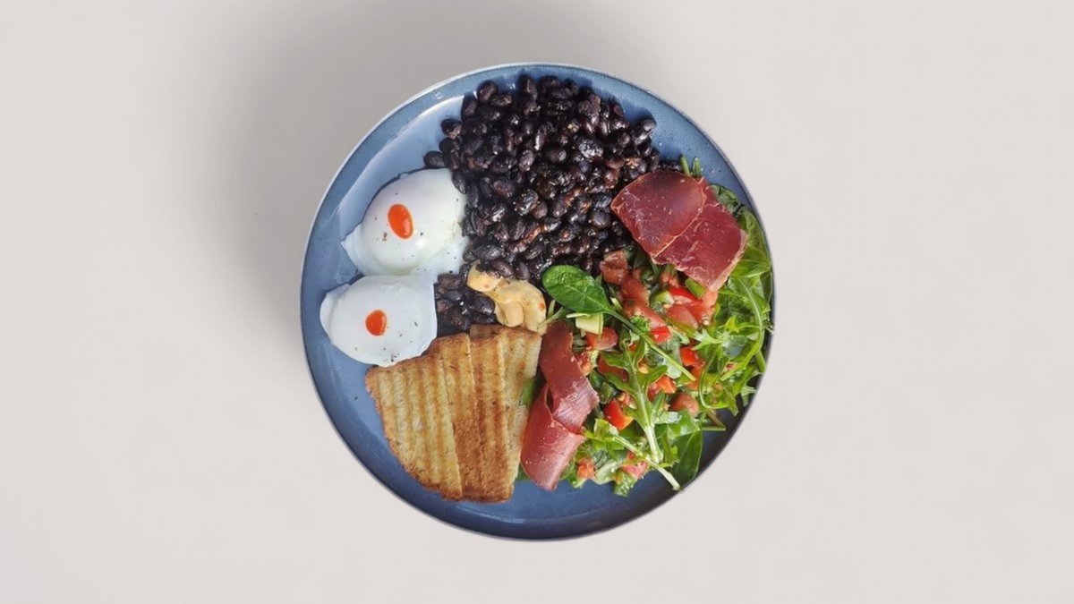 Μαύρα φασόλια , 2 αυγά ποσέ 🍳, φρέσκια σαλάτα 🥗, λεπτές φέτες προσούτο & τραγανό ψημένο ψωμί 🥖. Ιδανικό brunch με latin twist ☀️✨ Επιλογή αυγά τηγανητά, ποσέ ή scrambled eggs.