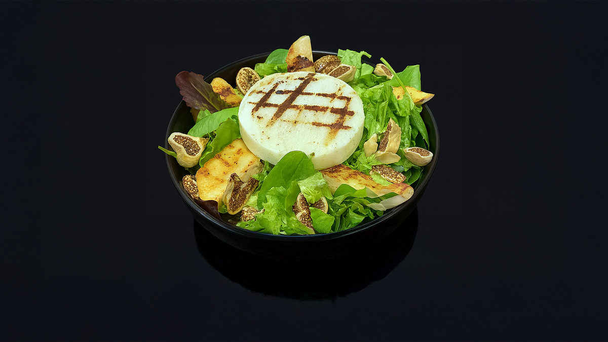 Φρέσκα ανάμεικτα σαλατικά, συκο, ψητό μανούρι, κοτοπουλο φιλετο, κρουτών, φιλέ αμυγδάλου και βινεγκρέτ μελιου