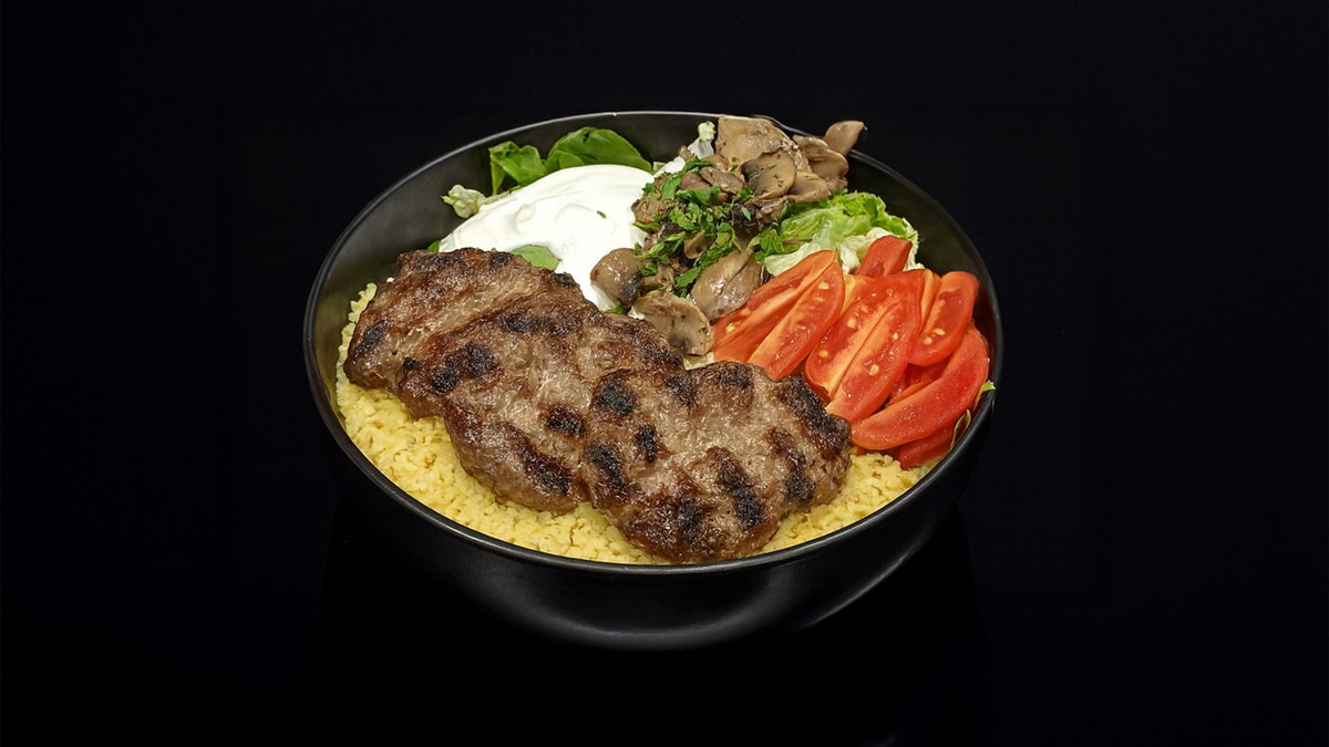 Μπιφτέκια μοσχαρίσια σχάρας, πληγούρι ή πατάτες τηγανιτές, μανιτάρια σωτέ, sour cream, τομάτα, μιξ σαλάτας
