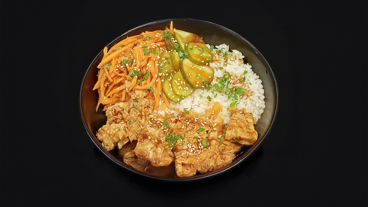 Πικάντικο τραγανό κοτόπουλο με ρύζι ατμού, kimchi αγγουριού και tonkatsu sauce.