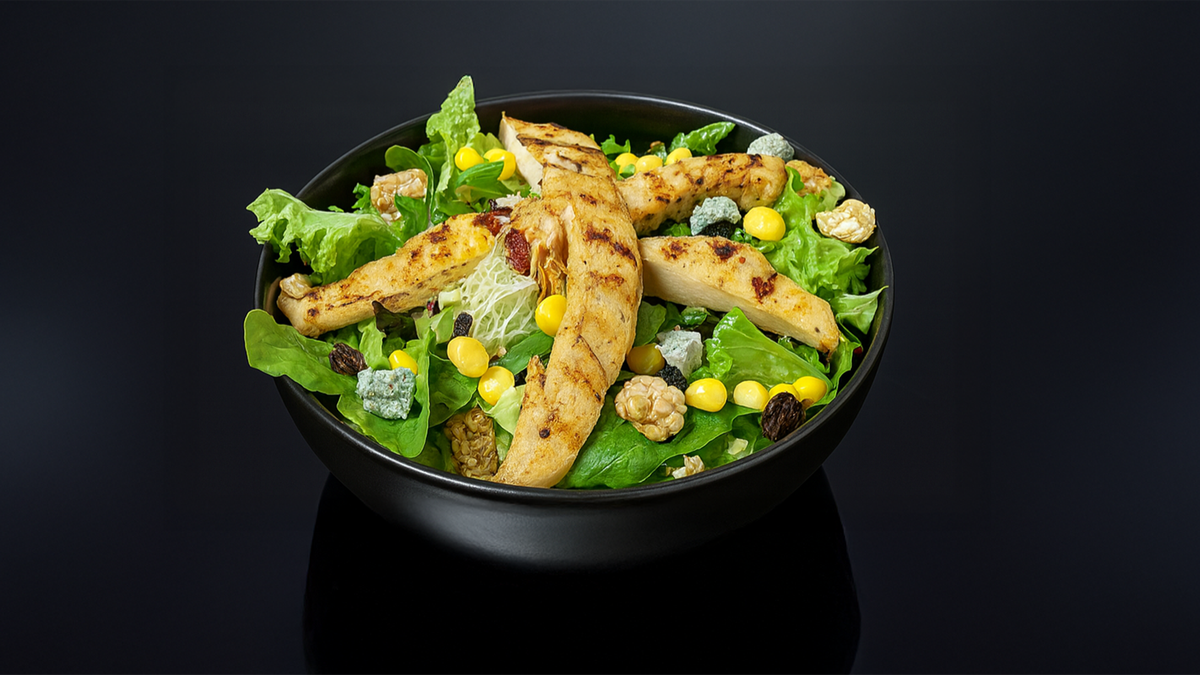Σαλάτα με mix σαλατικών, blue cheese, κοτόπουλο, γλυκόξινη σταφίδα, καλαμπόκι, κρουτόν από κουλουράκι, αμύγδαλο και vinaigrette μέλι-μουστάρδα