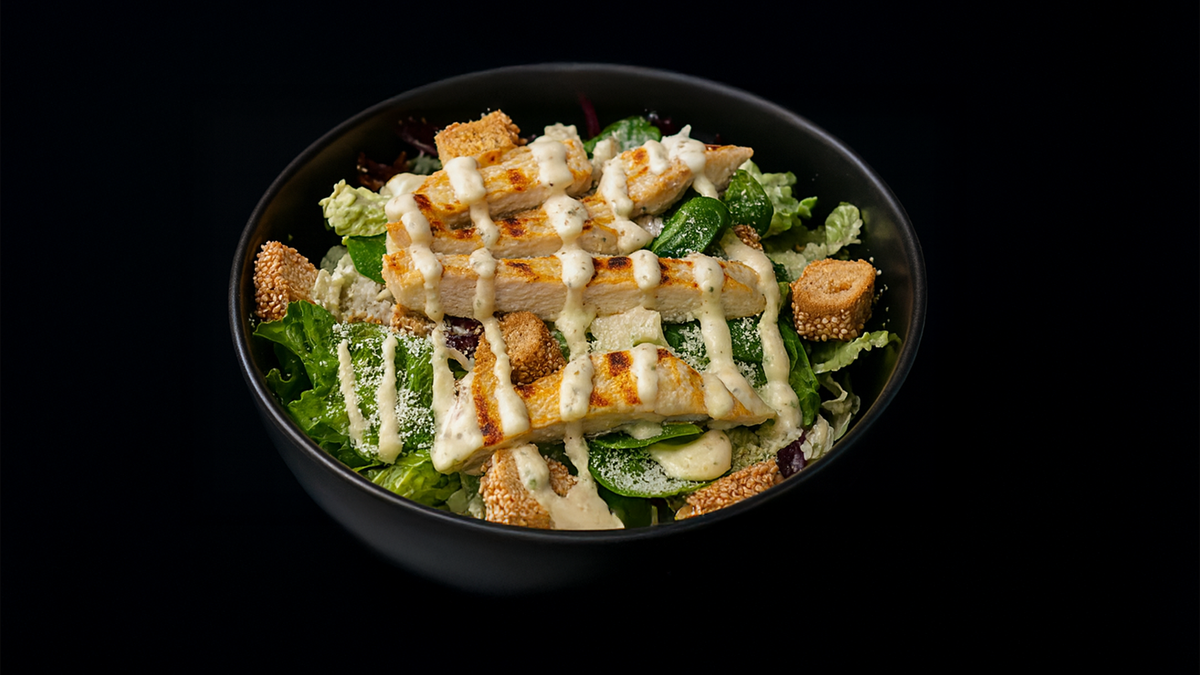 Σαλάτα με φρέσκα τραγανά σαλατικά, χωριάτικο κρουτόν, παρμεζάνα, κοτόπουλο και Caesar`s dressing