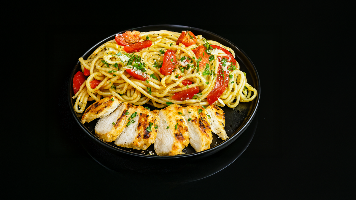 Βουτυράτο σοταρισμένο σκόρδο, ζουμερά τοματίνια και φρέσκα μυρωδικά δένουν τέλεια με τα Spaghettoni, συνοδεία τρυφερού ψητού κοτόπουλου στήθος. Έντονο, αρωματικό και απολαυστικό.