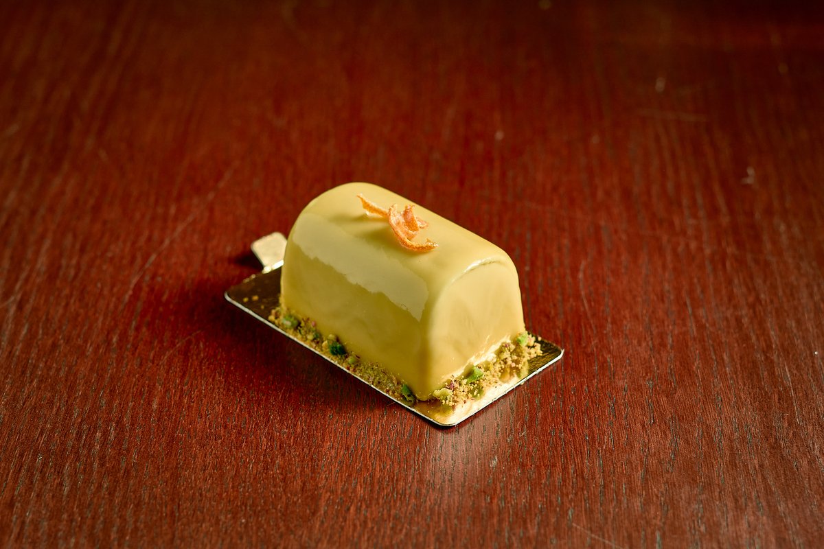 Vegan and gluten free Μωσαϊκό με φυστίκι Αιγίνης, gel πορτοκάλι και mousse φτιαγμένη με την signature πραλίνα φυστικιού μας