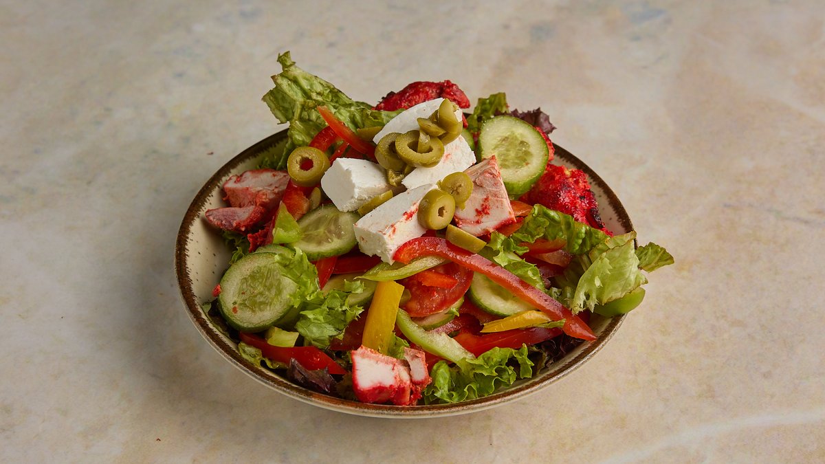 Salad with chopped chicken fillet, marinated in spices, lettuce, onion, cucumber, homemade cheese, pepper and cherry tomatoes