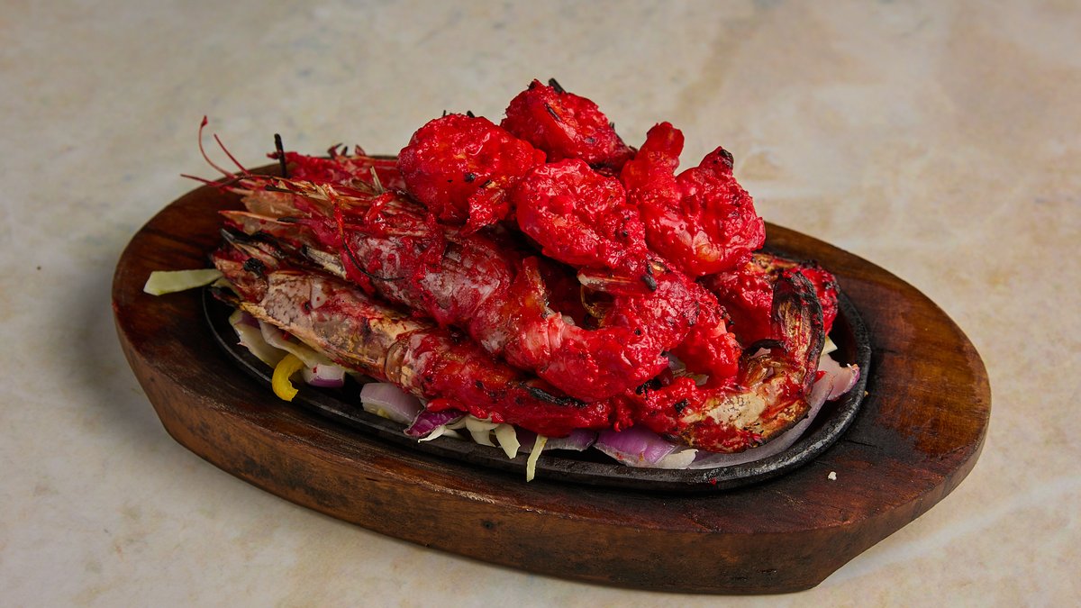 Jumbo shrimps marinated in a light spice mix, baked in tandoor