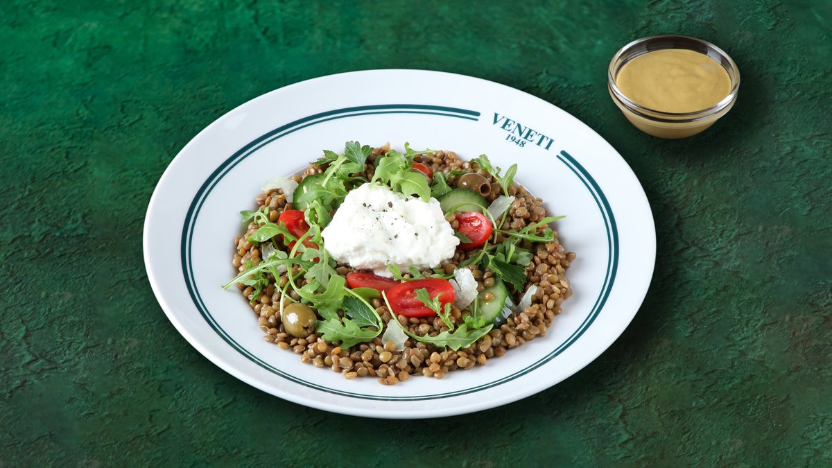 Με μοτσαρέλα φρέσκια, ντομάτα, σαλάτα ρόκα μαρούλι, σάλτσα πέστο, λιαστή ντομάτα και ελαιόλαδο