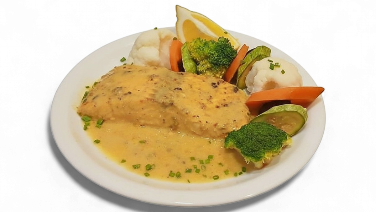 Φιλέτο σολομού ψητό στο φούρνο. Συνοδεύεται από βραστά λαχανικά.