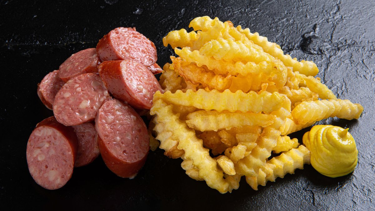 Mερίδα με ένα λουκάνικο γεμιστό με τυρί gouda. Συνοδεύεται από τηγανητές πατάτες krisspy και μουστάρδα