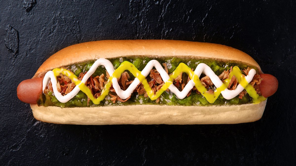 Λουκάνικο βραστό Φρανκφούρτης ή ψητό χωριάτικο, τραγανό παναρισμένο κρεμμυδάκι, Relish αυθεντική αμερικάνικη hot dog sauce, μουστάρδα με μέλι και μαγιονέζα