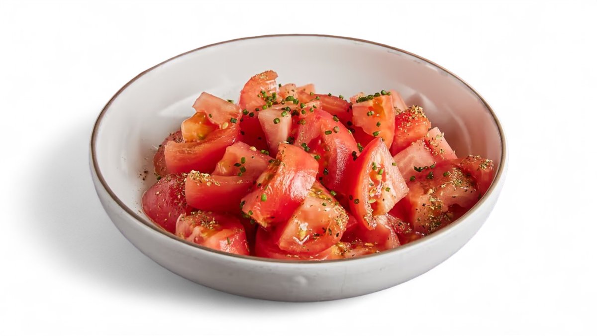 Μυρωδικά, άνηθος, ντομάτα και αγγούρι ψιλοκομμένα, φρέσκο κρεμμύδι, ελαιόλαδο, λευκό ξύδι και φρέσκο πιπέρι