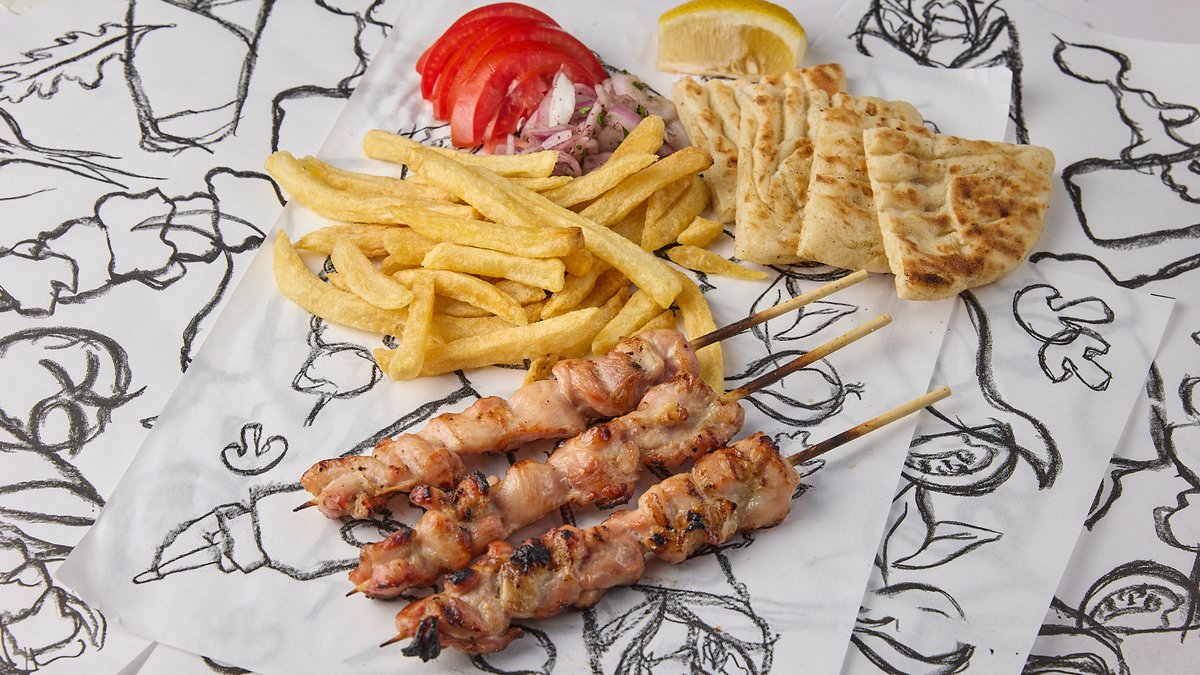 3 τεμάχια. Συνοδεύεται από πατάτες τηγανητές, ντομάτα, κρεμμύδι, πίτα και τζατζίκι