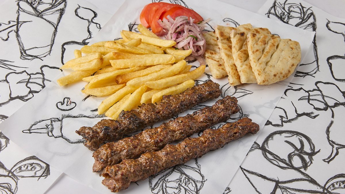 3 τεμάχια. Συνοδεύεται από πατάτες τηγανητές, ντομάτα, κρεμμύδι, πίτα και γιαούρτι