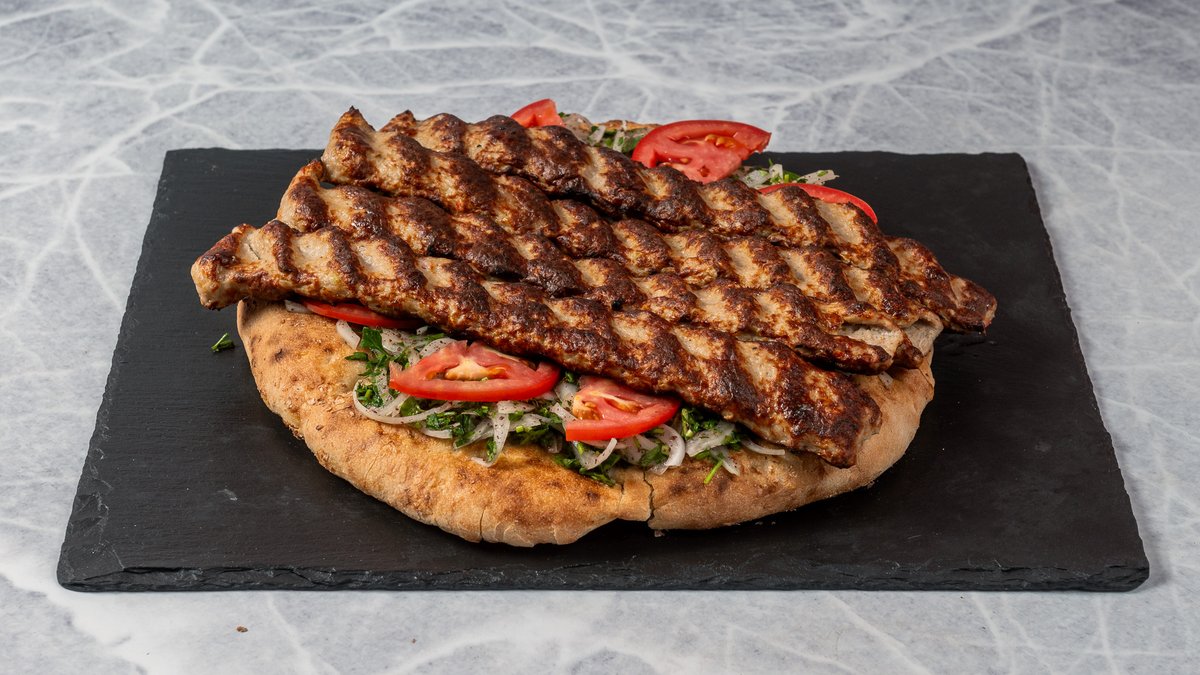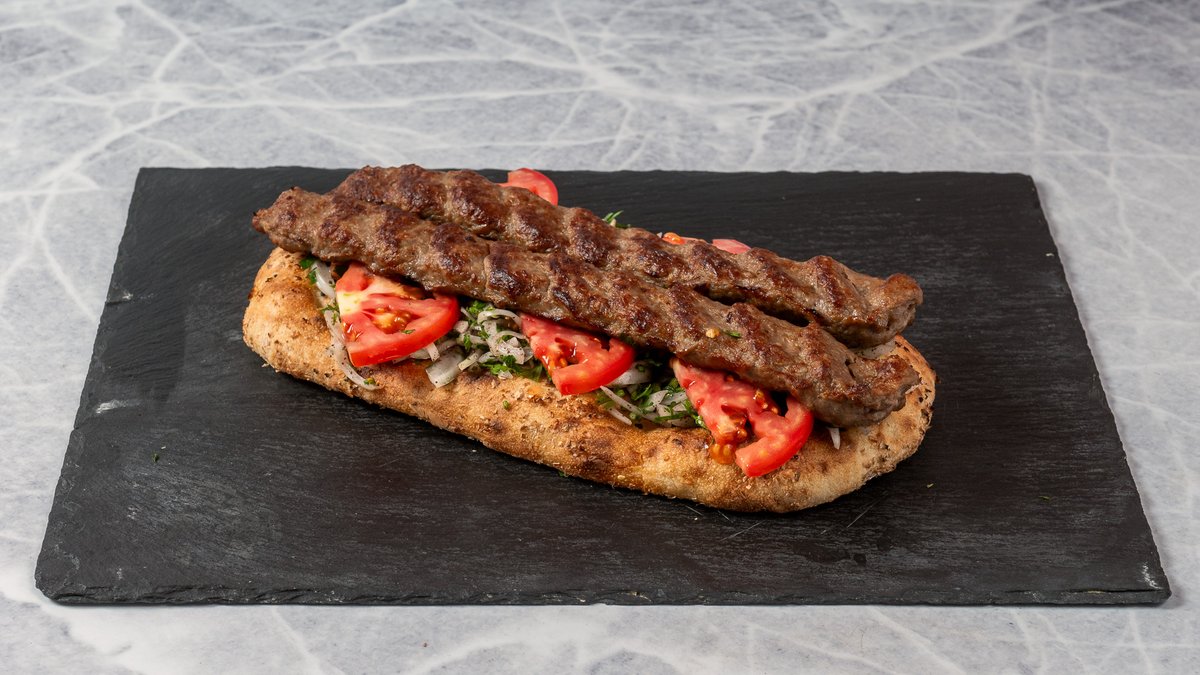 Ιρανική πίτα 30cm με ένα κεμπάπ 120g, κρεμμύδι, μαϊντανό και ντομάτα. Συνοδεύεται από σάλτσα της επιλογής σου