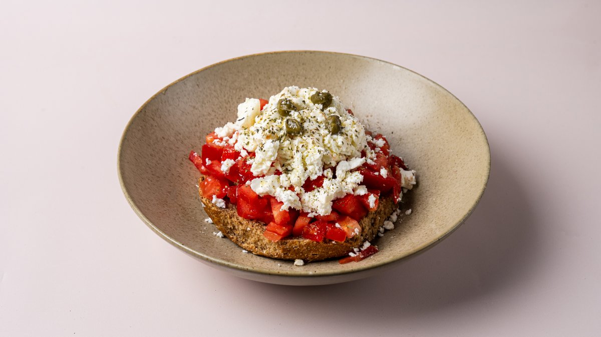 Ντάκος κρητικός, ντομάτα, φέτα Π.Ο.Π, κάπαρη, ελαιόλαδο