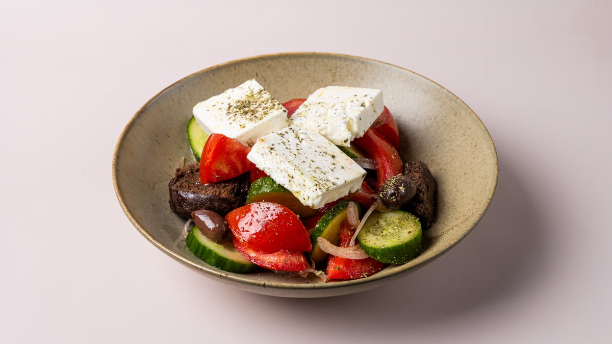 Ντομάτα, αγγούρι, κρεμμύδι φέτα Π.Ο.Π, χαρουποπαξίμαδα, κάπαρη, ελιές, ελαιόλαδο