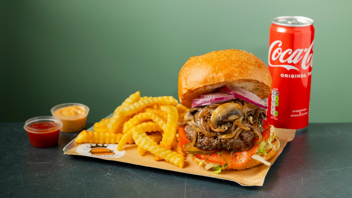 Με ντομάτα, iceberg, πίκλες, κρεμμύδι, μανιτάρια και καραμελωμένα κρεμμύδια. Συνοδεύεται από πατάτες τηγανητές