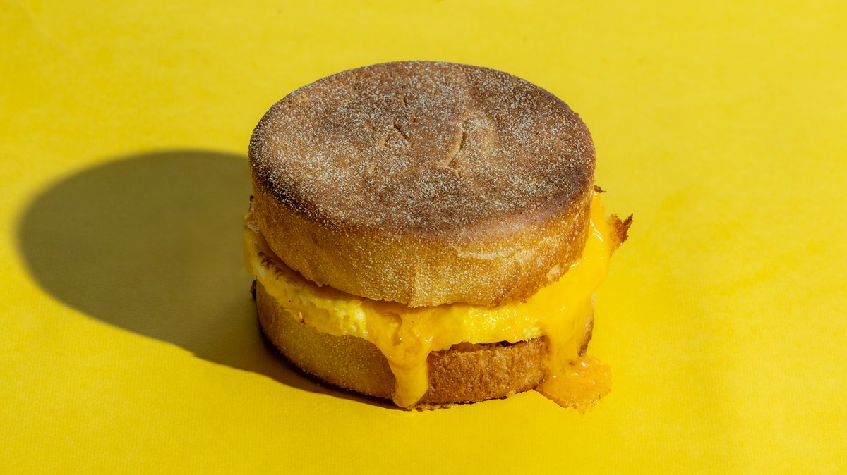 English muffin με ομελέτα φούρνου, μαρμελάδα μπέικον και τυρί τσένταρ. To προϊόν σερβίρεται μόνο ζεστό.