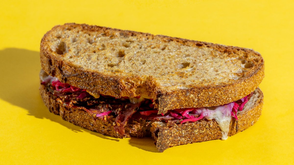Παστράμι, τυρί εμεντάλ, κόκκινο ξινολάχανο, τουρσί και μαγιονέζα σε ψωμί ολικής άλεσης. To προϊόν σερβίρεται μόνο ζεστό.