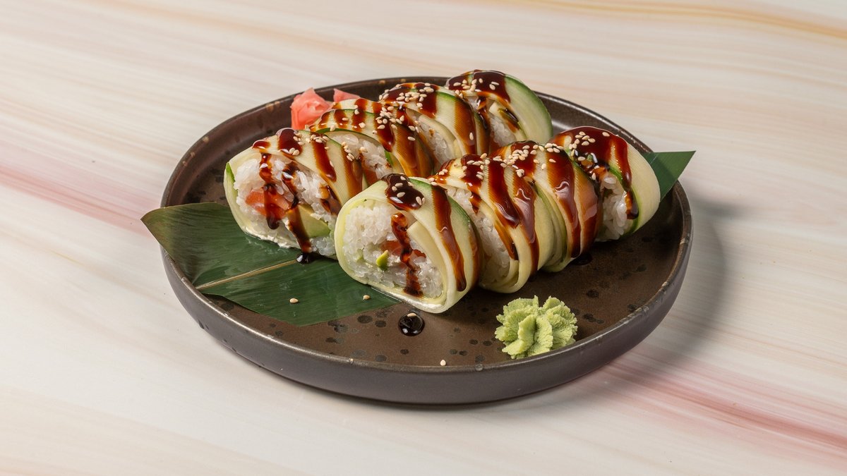 Ρολό με γέμιση αγγούρι, αβοκάντο και από πάνω καψαλισμένο σολομό, teriyaki σως και σουσάμι