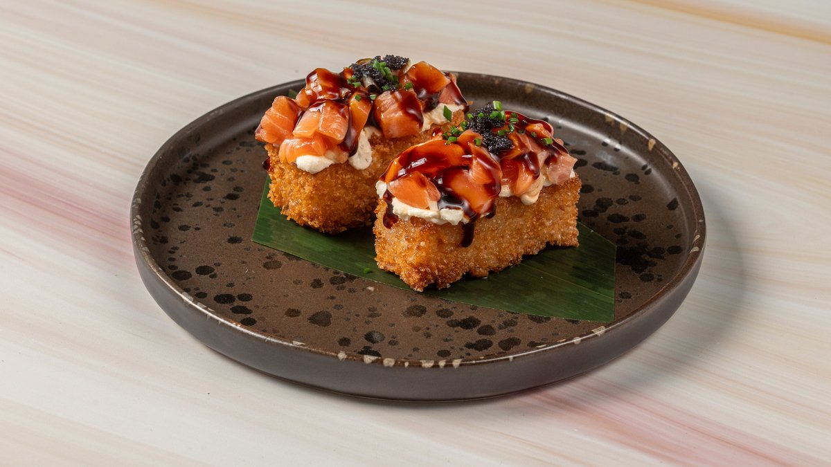2 Τεμάχια. Τηγανητό ρύζι με panko, τυρί κρέμα, μαριναρισμένο σολομό με ponzu και φρέσκο κρεμμύδι, teriyaki sauce, σχοινόπρασο και black masago