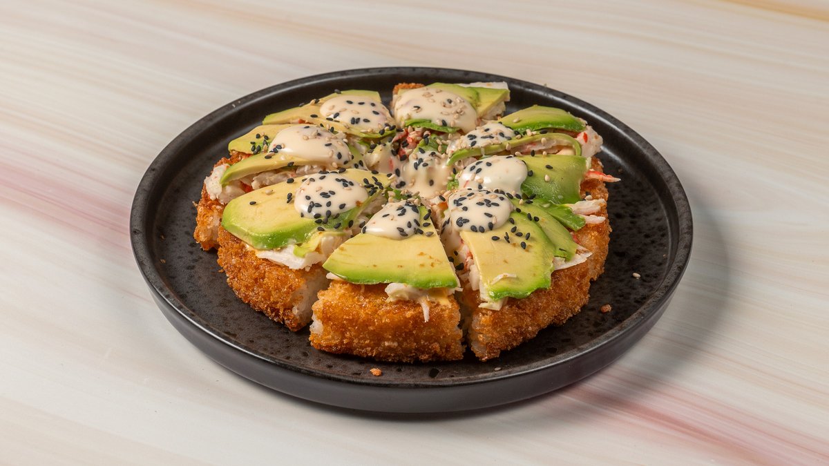 Τηγανητό ρύζι με panko, cheddar sauce, surimi μαριναρισμένο με salad sauce και φρέσκο κρεμμύδι, αβοκάντο και sweet chili mayo sauce