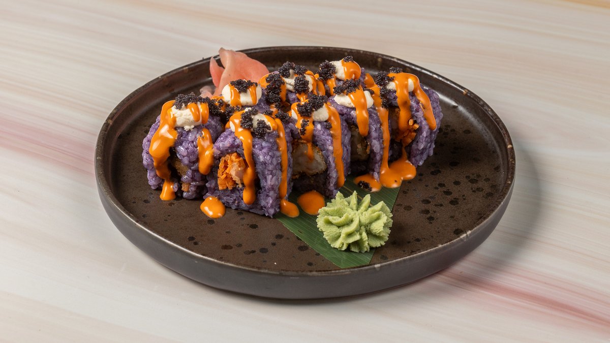Με γέμιση γαρίδα tempura, αγγούρι και κρέμα τυριού και από πάνω αβοκάντο, wasabi mayo, crunchie και από κάτω spicy mayo sauce