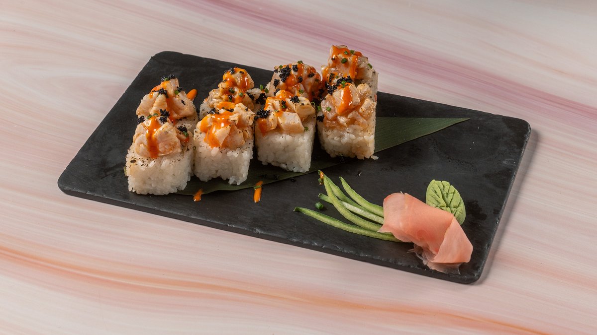 Με γέμιση γαρίδα, αβοκάντο, spicy mayo και από πάνω μαριναρισμένο τόνο, κρέμα τυριού, green masago και teriyaki σως