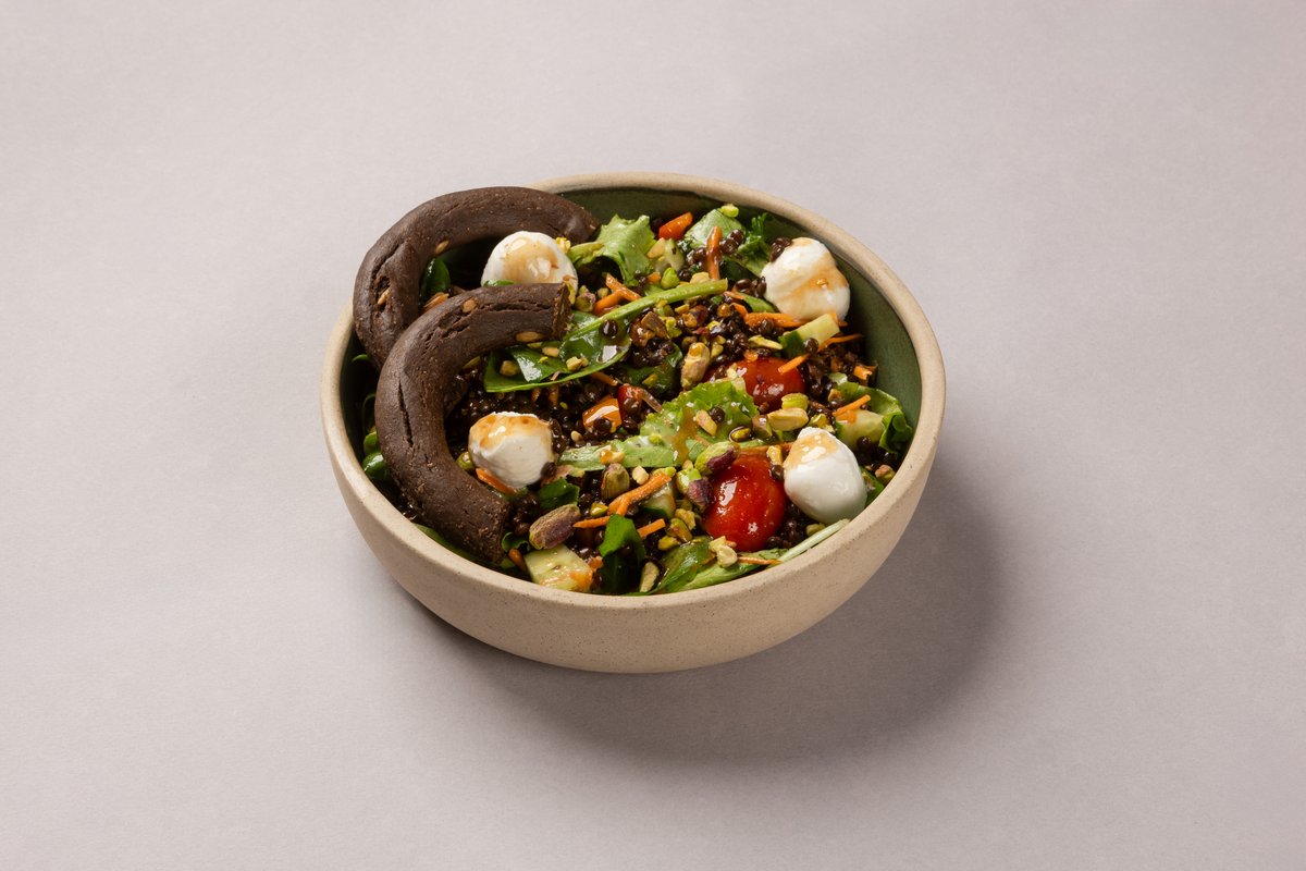Φακές Beluga, baby φύλλα, πολύχρωμες πιπεριές, τοματίνια, αγγουράκι Κνωσσού, bocconcini mozzarella, φιστίκι Αιγίνης, vinaigrette Balsamico