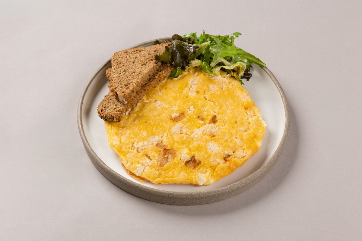 Ψωμί Brioche ψημένο στο φούρνο με αυγά ελευθέρας βοσκής ομελέτα, καπνιστο χοιρομέρι και Μετσοβόνε. Σερβίρεται με side salad.