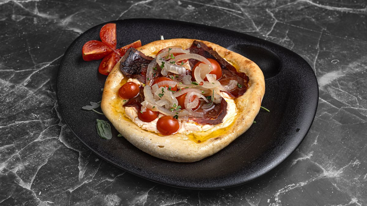 With kasseri, tomato, Florina pepper cream, pastourma