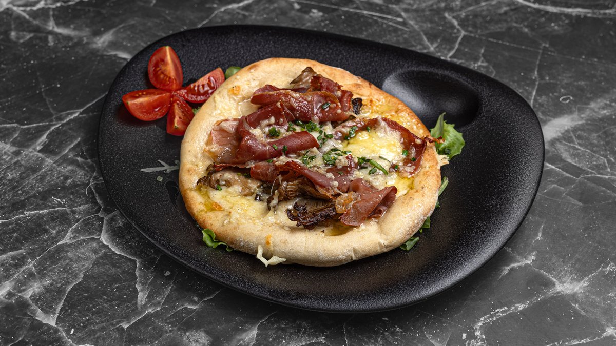 With Grevena truffle paste, Zochou kasseri, variety of mushrooms, smoked pancetta