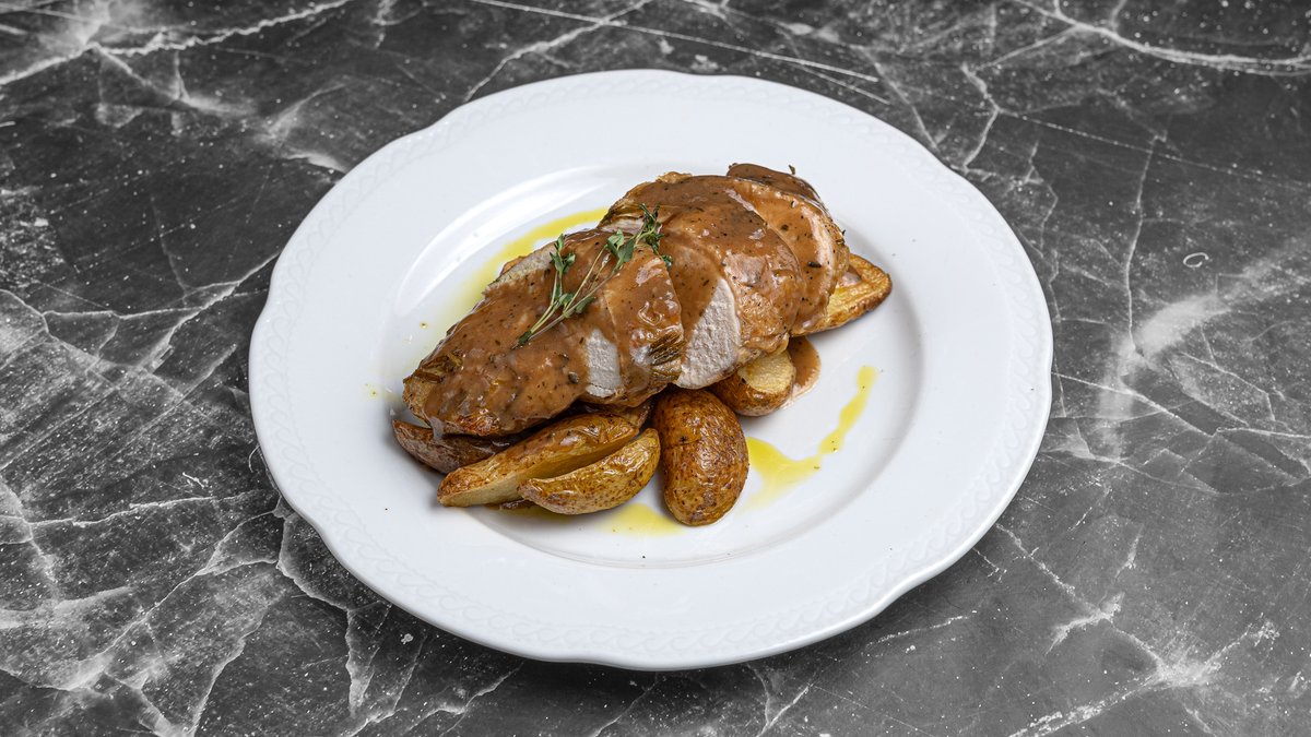 Wrapped in lamb caul fat, manouri, Florina pepper, roast sauce, young potatoes