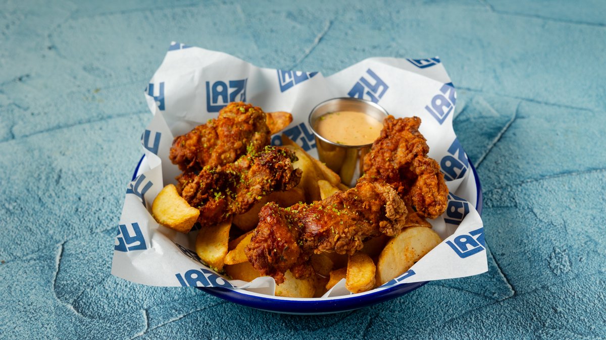 Τραγανό κοτόπουλο με πατάτες τηγανητές και pink sauce