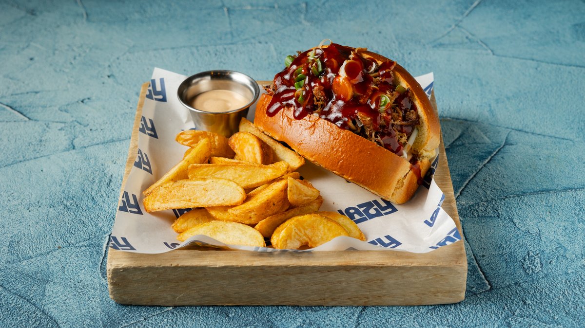 Σιγομαγειρεμένο χοιρινό σε μαύρη μπύρα, sriracha, μαγιονέζα, iceberg, φρέσκο κρεμμύδι, πίκλα και bbq sauce