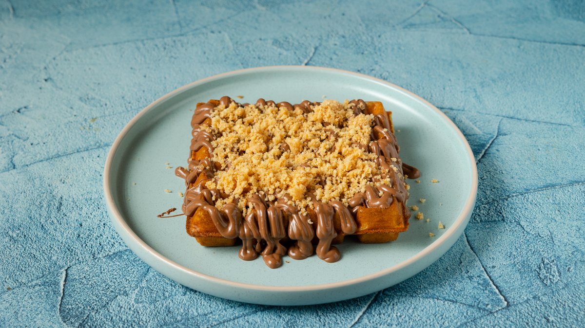 Pancakes με Σοκολάτα, Buttercookie Crumble και Καραμελωμένη Μπανάνα
