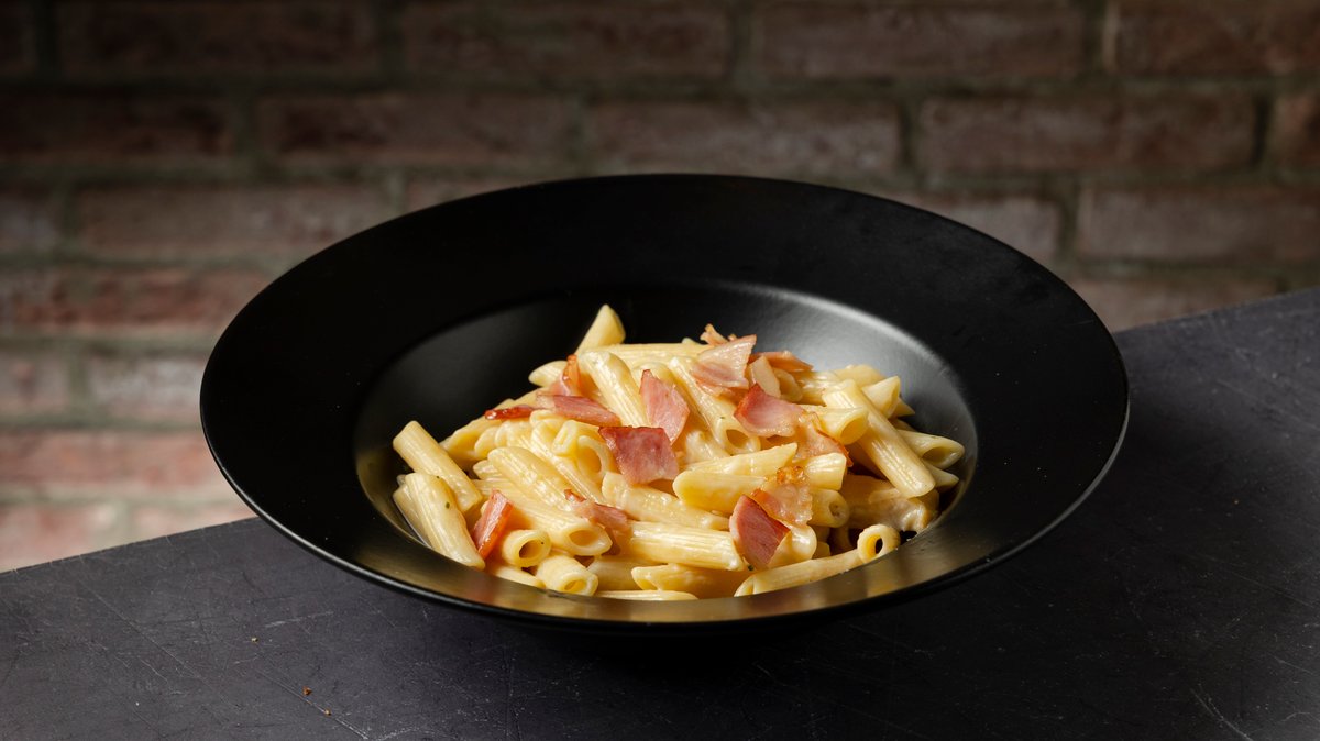 Με κρέμα γάλακτος, μανιτάρια και μπέικον. Συνοδεύεται από παρμεζάνα