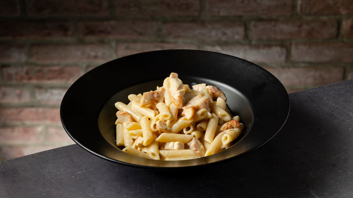 Με λευκή σάλτσα και φιλέτο κοτόπουλο. Συνοδεύεται από παρμεζάνα