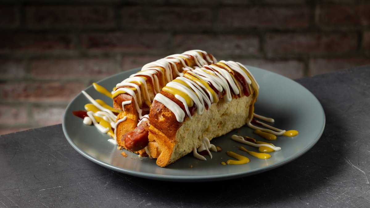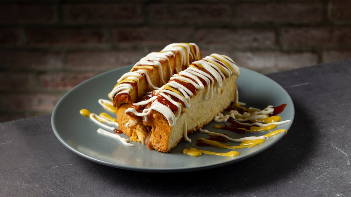 Με scrambled eggs, λουκάνικο, flakes παρμεζάνας, καραμελωμένα κρεμμύδια, μαγιονέζα, μουστάρδα και ketchup