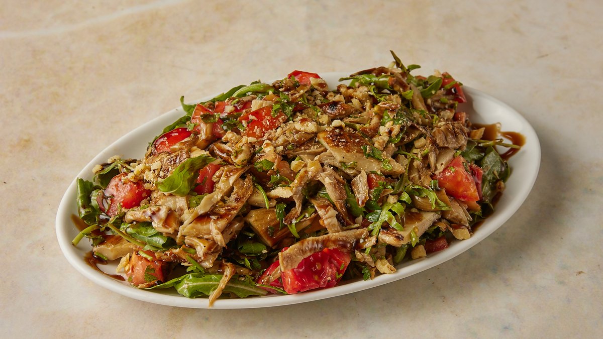 Σαλάτα με ντομάτα, αγγούρι, πιπεριές (κέρατο και Φλωρίνης), μαρούλι, μαϊντανό, baby ρόκα, δυόσμο, κάπαρη, ελιές, σως ροδιού και extra παρθένο ελαιόλαδο