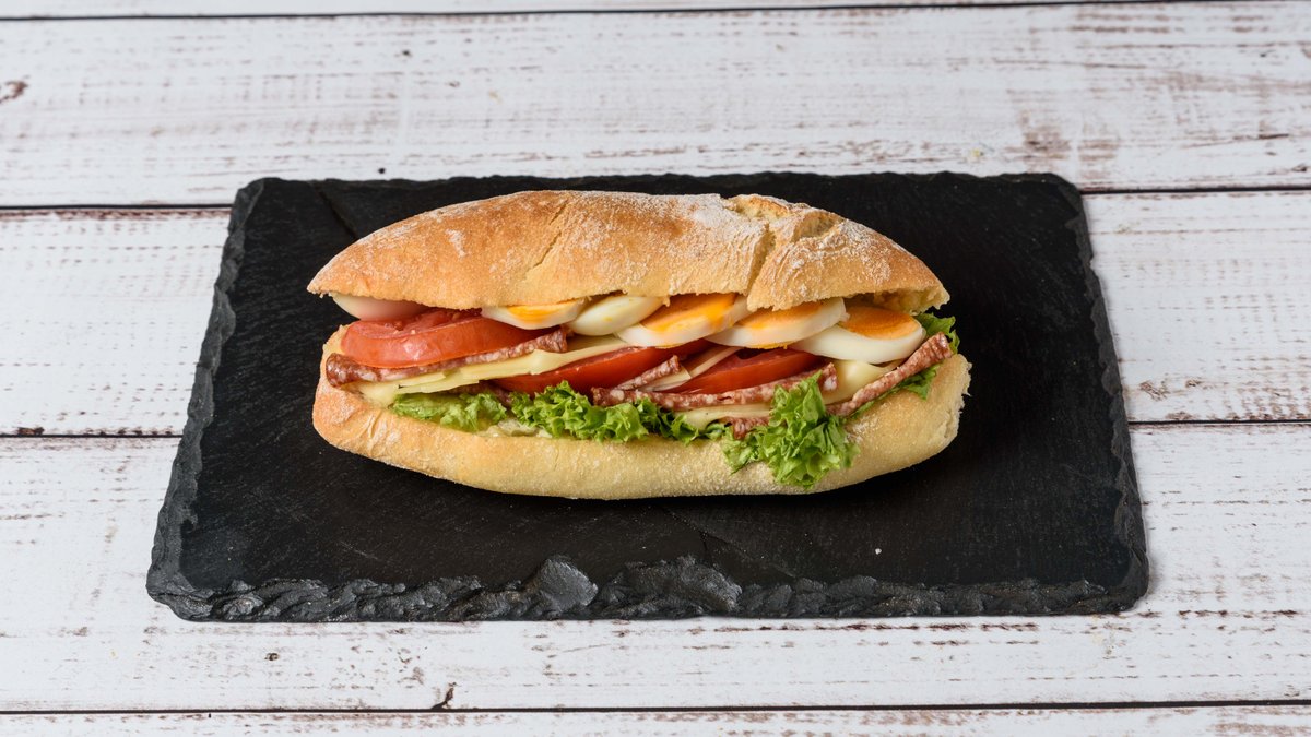Fluffy bread roll with tomato, lettuce, and olive paste