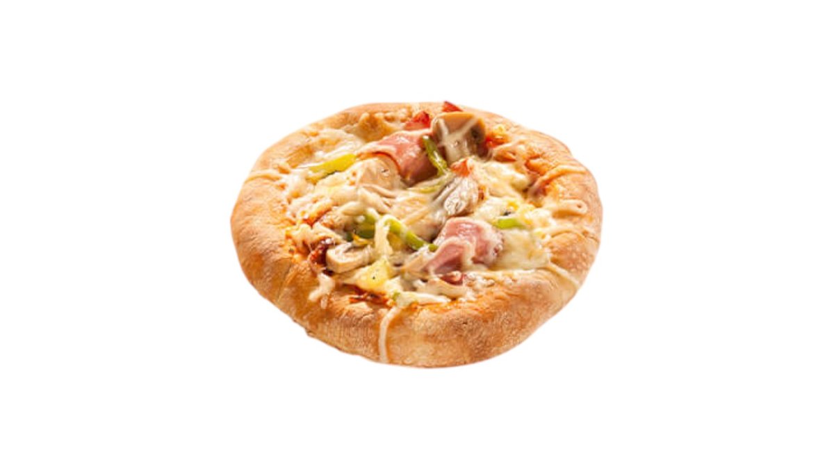 With tomato sauce, gouda cheese, ham, bacon, and bell pepper