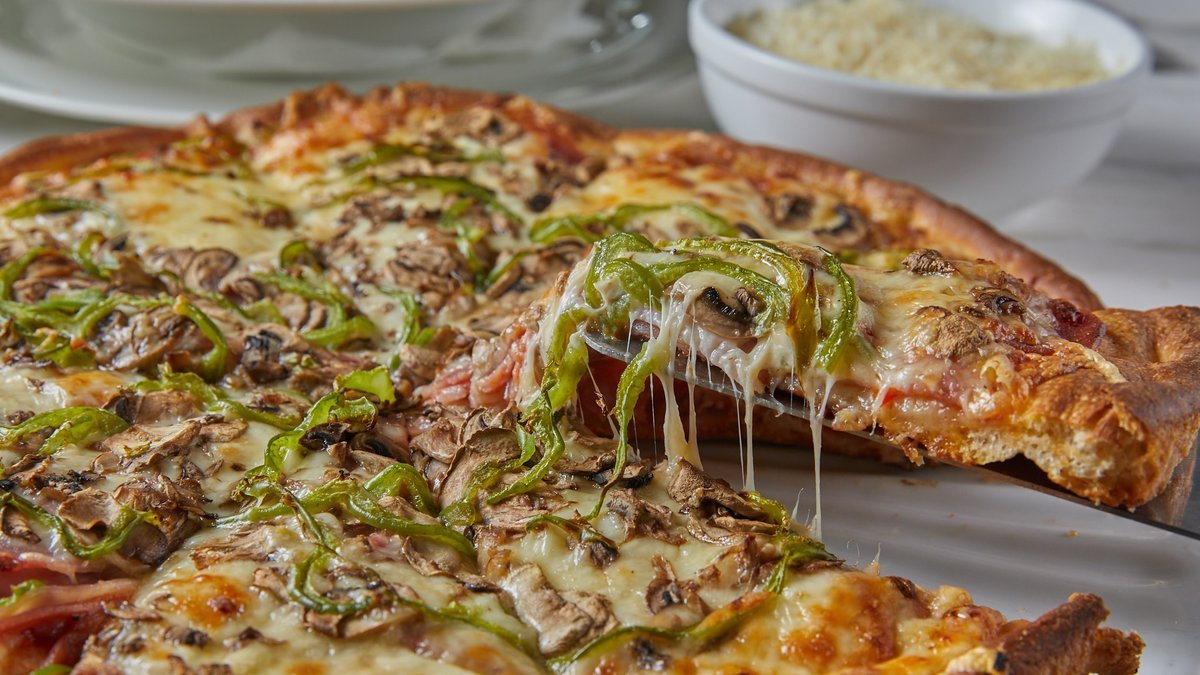 Μεσαία (8 κομμάτια) Με σάλτσα ντομάτας, mix τυριών (gouda και edam), ζαμπόν, μπέικον, πεπερόνι, σαλάμι αέρος, μανιτάρια και πράσινη πιπεριά